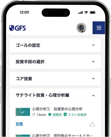 ※「GFS」は、投資や金融、経済などの知識を動画で視聴することで学び、受講いただいた方の金融知識を高めることを目的とした純粋な情報提供および教育サービスです。 金融や投資、経済に関する用語や指標、仕組みなどを解説・説明するものであり、投資や金融商品の購入・売却等を推奨するものではありません。
